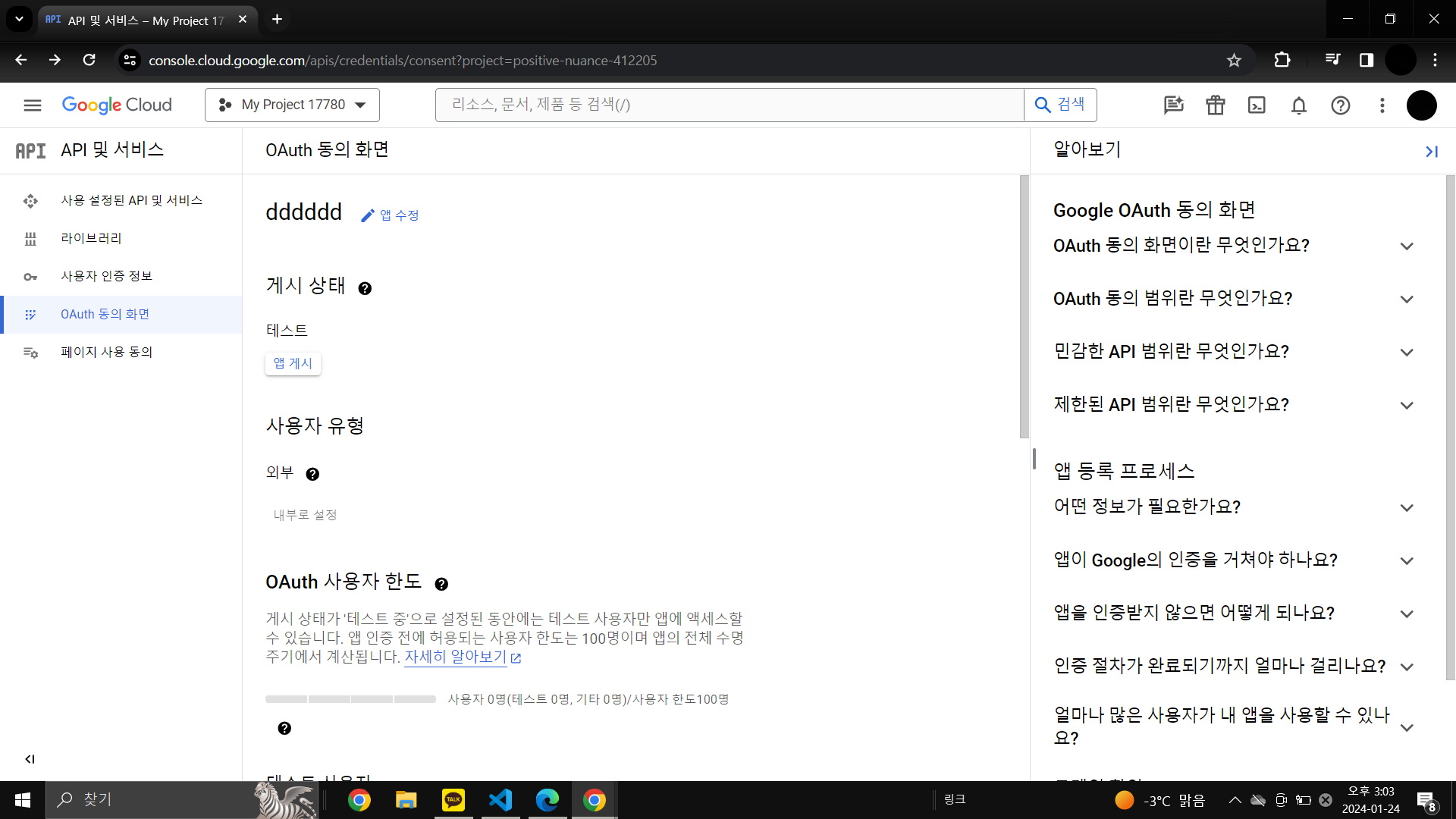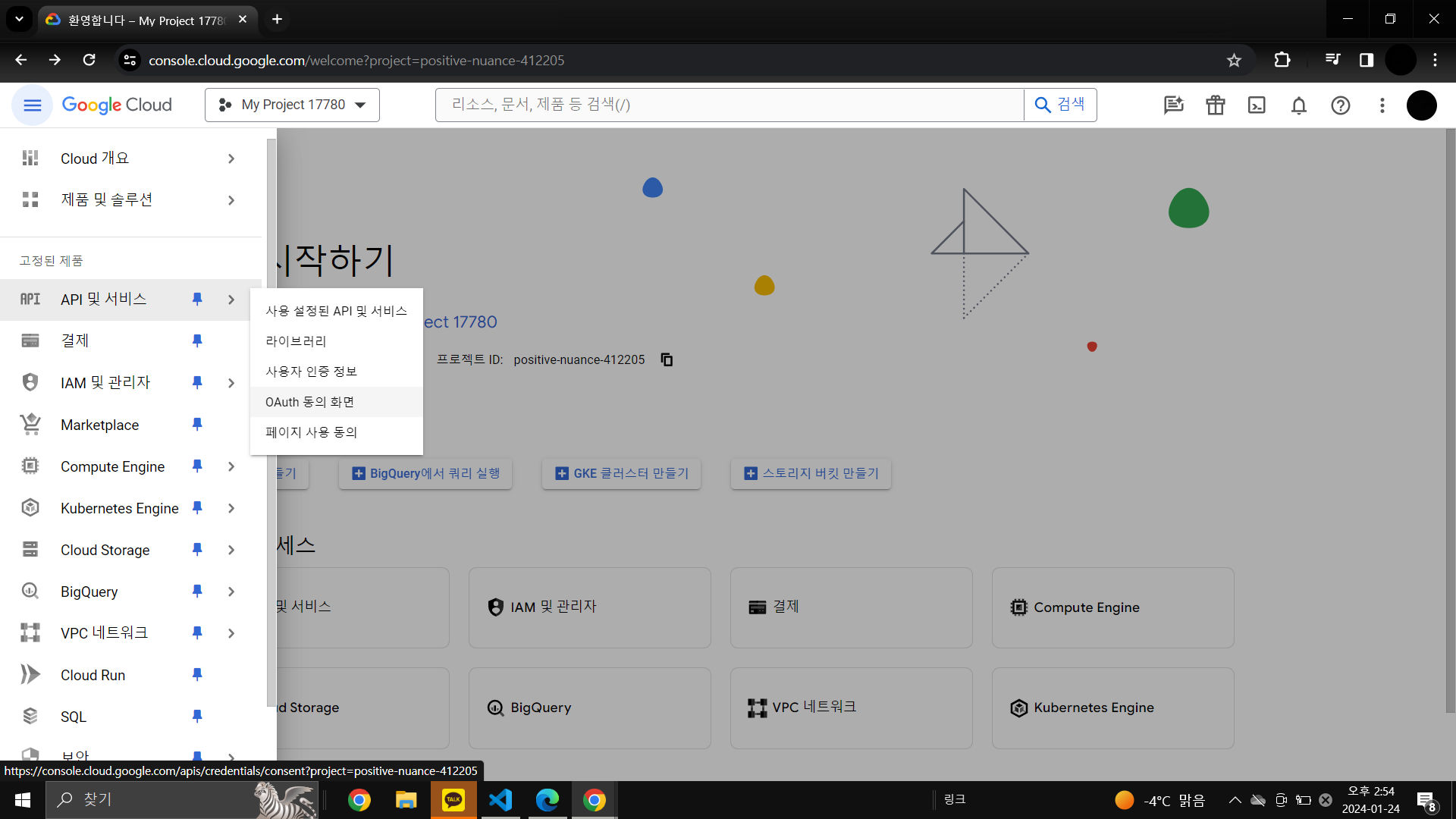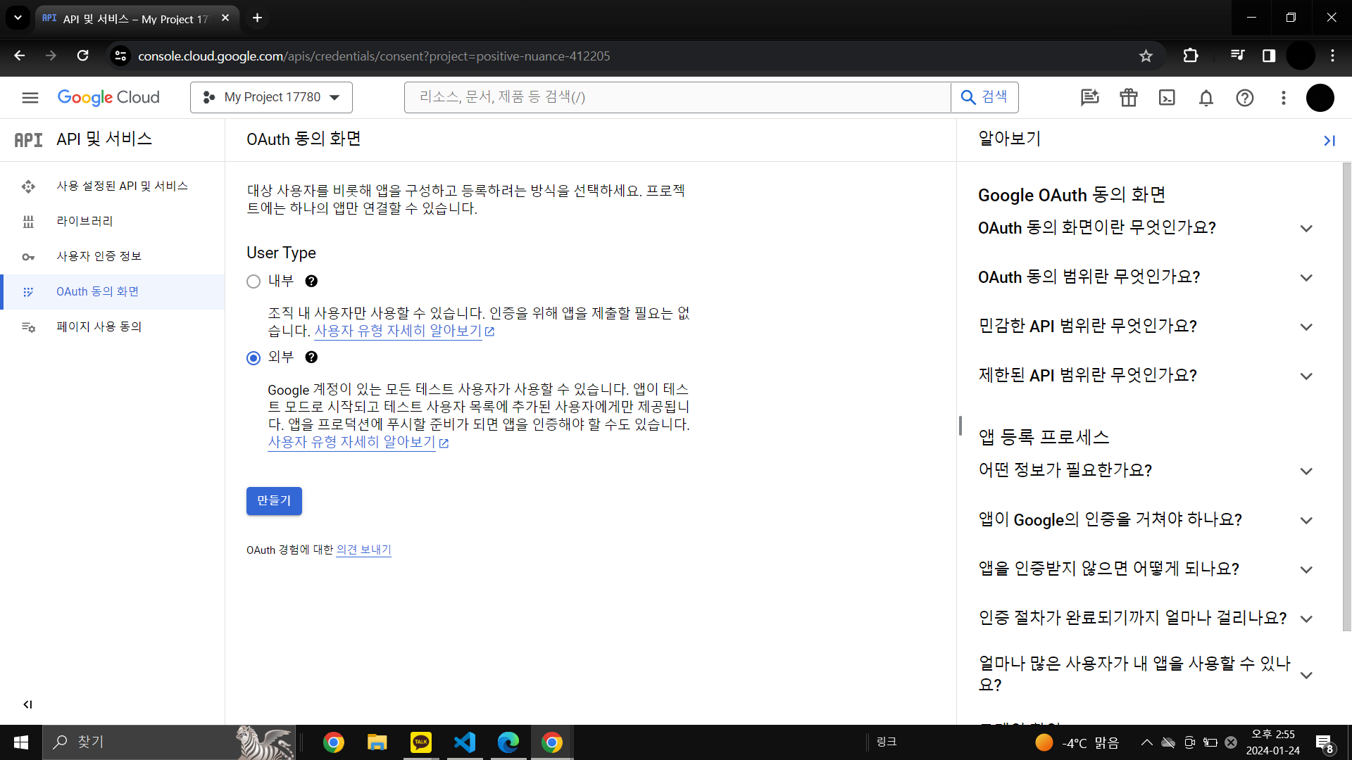 왼쪽위 네비게이션 바 연 후 API 및 서비스 -> OAuth 동의화면 선택