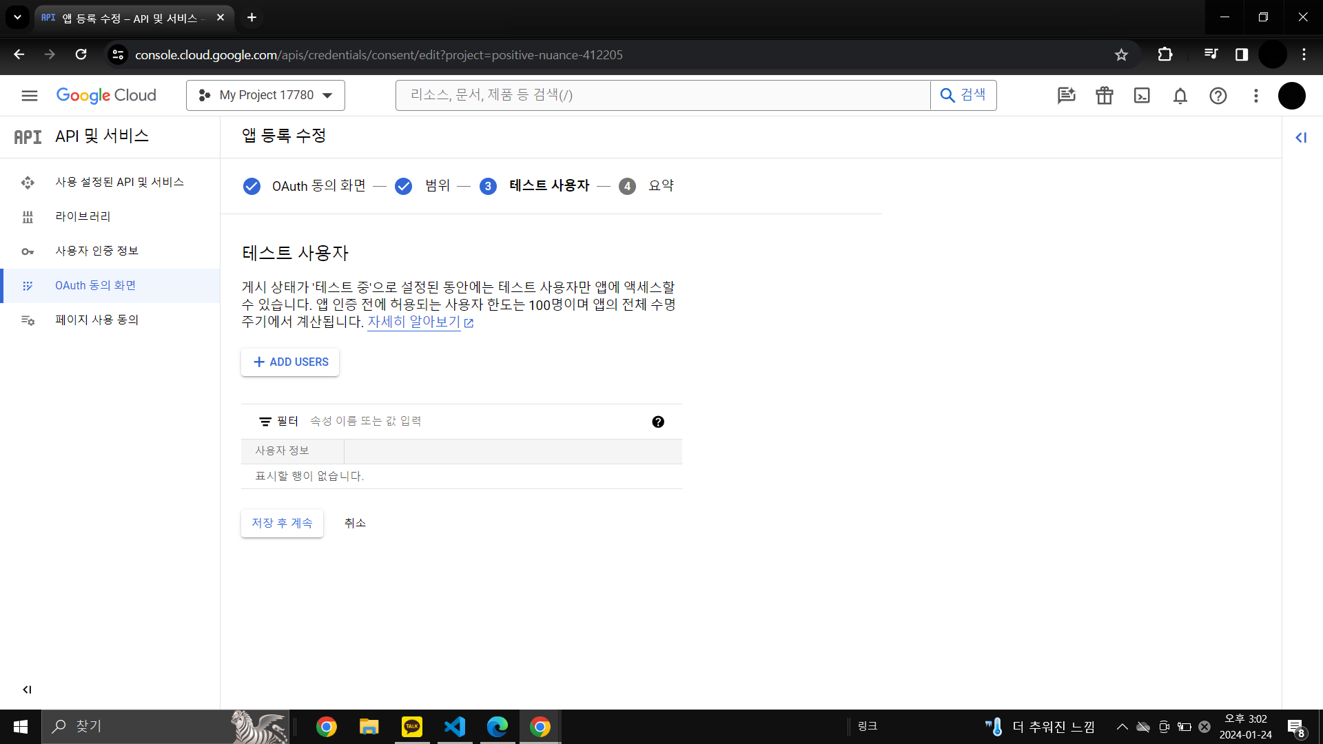 필수 입력 조건 3개 입력(앱정보-앱이름 / 앱정보-사용자 지원 이메일 / 개발자 연락처 정보-이메일 주소) -> 저장 후 계속