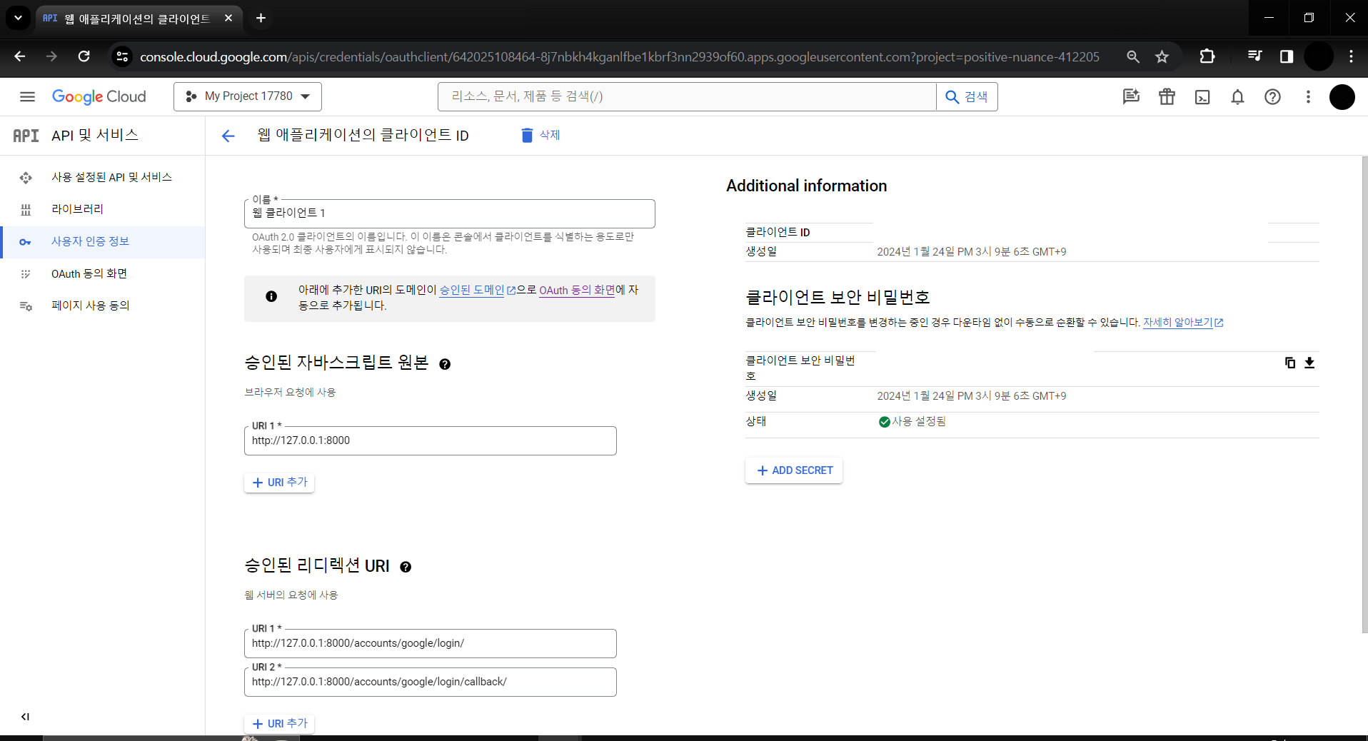 승인된 리디렉션 URI의 경우