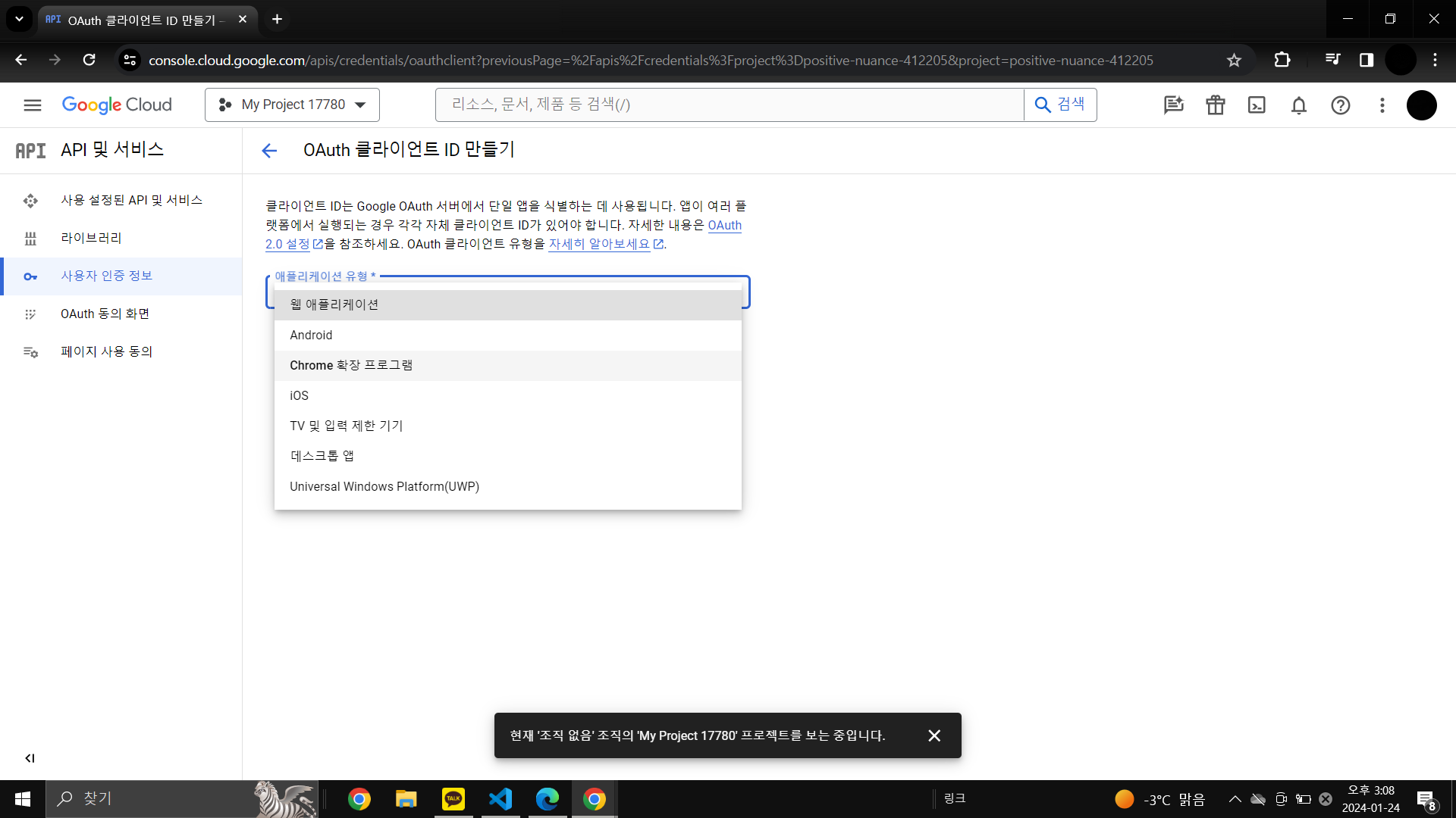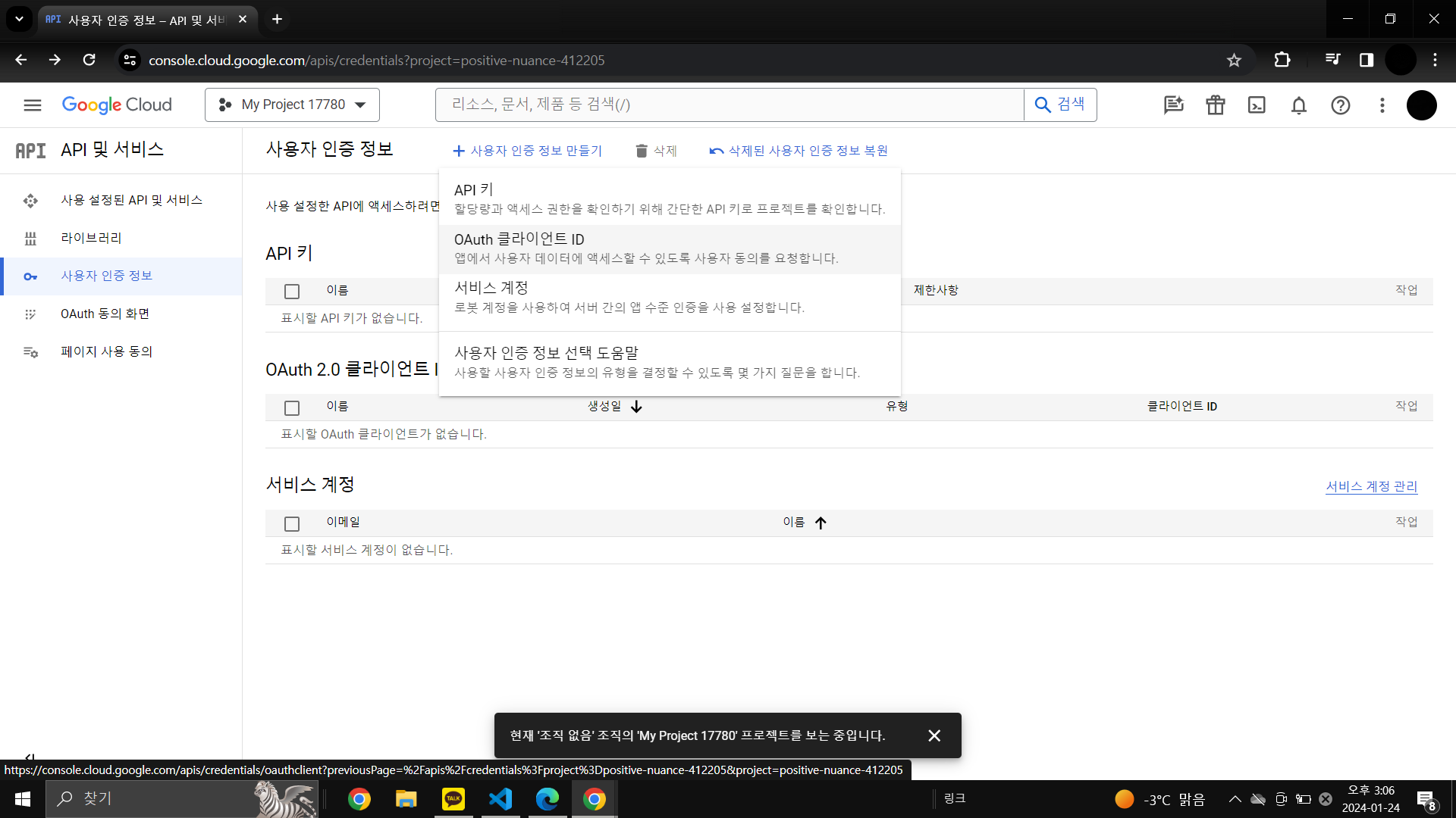 이 후에는 왼쪽 네비게이션바의 '사용자 인증 정보' 클릭 -> '사용자 인증정보 만들기' -> 'OAuth 클라이언트 ID'선택