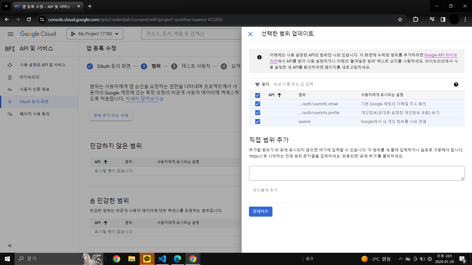 그 후 '범위 추가 또는 삭제' 선택 후 해당 3개 선택(필요에 따라 변경해도 됨) -> 저장 후 계속
