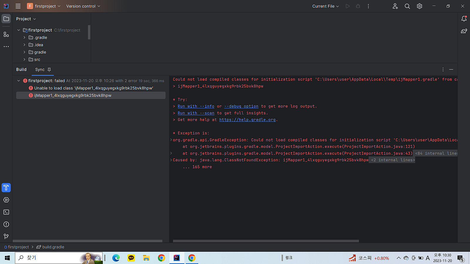 스프링부트 프로젝트 생성 과정에서 Could not load compiled classes for initialization script 'C:\Users\user\AppData\Local\Temp\ijMapper1.gradle' from cache. 이와 유사한 오류가 발생하였을 경우 해결 방법을 알려드리겠습니다! 해결방법은 매우 간단한데 정보가 별로 없어서 저는 시간이 매우 오래결렸습니다... 저처럼 고통받는 사람이 줄기를 바라며 글 남깁니다. 해결방법은 gradle 캐시 문제이기 때문에 "C:/Users/username/.gradle/caches" 경로 들어가서 모든 파일을 삭제한 후 재시작하면 해결됩니다!!